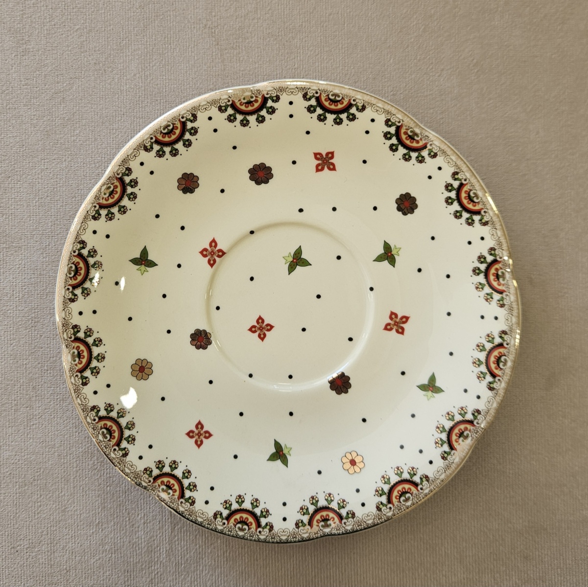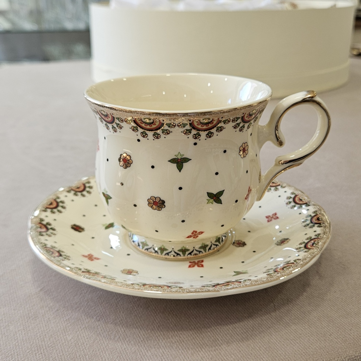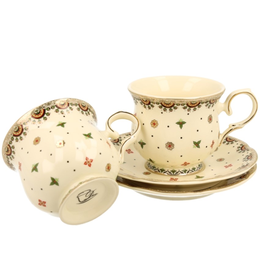 Pękate filiżanki wykonane z najwyższej jakości porcelany w kolorze śmietankowym wykończonej złotymi zdobieniami oraz delikatnym symetrycznymi kwiatuszkami. Klasyczna stylistyka zadowoli najbardziej wymagające gusta.