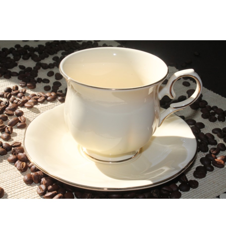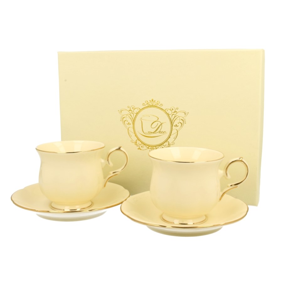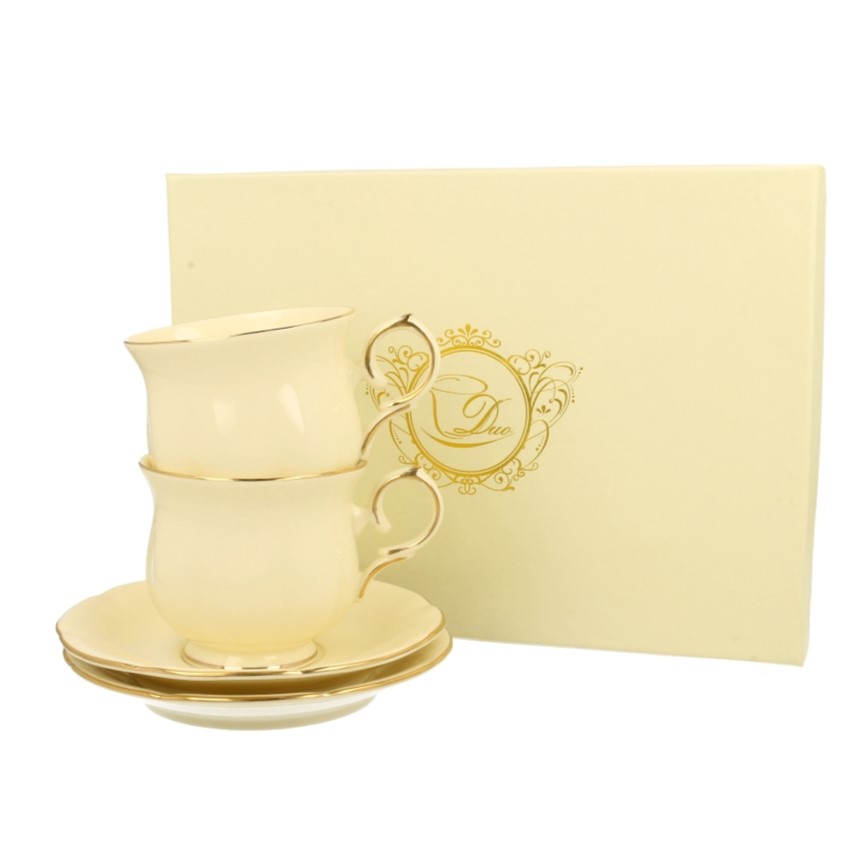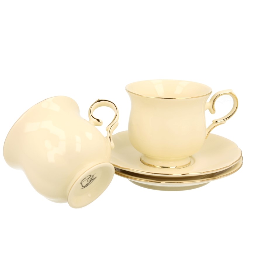 Pękate filiżanki wykonane z najwyższej jakości porcelany w kolorze śmietankowym wykończonej eleganckimi złotymi zdobieniami. Klasyczna stylistyka zadowoli najbardziej wymagające gusta.