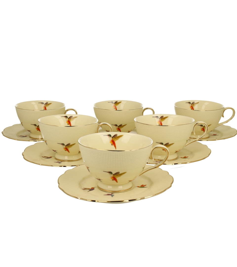 Komplet 6 filiżanek ze spodkami KOLIBRY wchodzący w skład serii ECRU Exclusive, wykonany z porcelany New Bone China w subtelnym kolorze ecru, która charakteryzuje się delikatnym połyskiem oraz wyjątkową wytrzymałością i trwałością, zachowując przy tym lekkość i finezję.