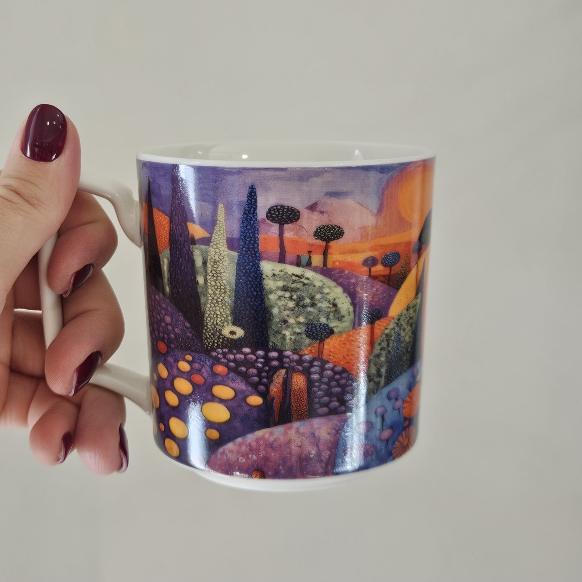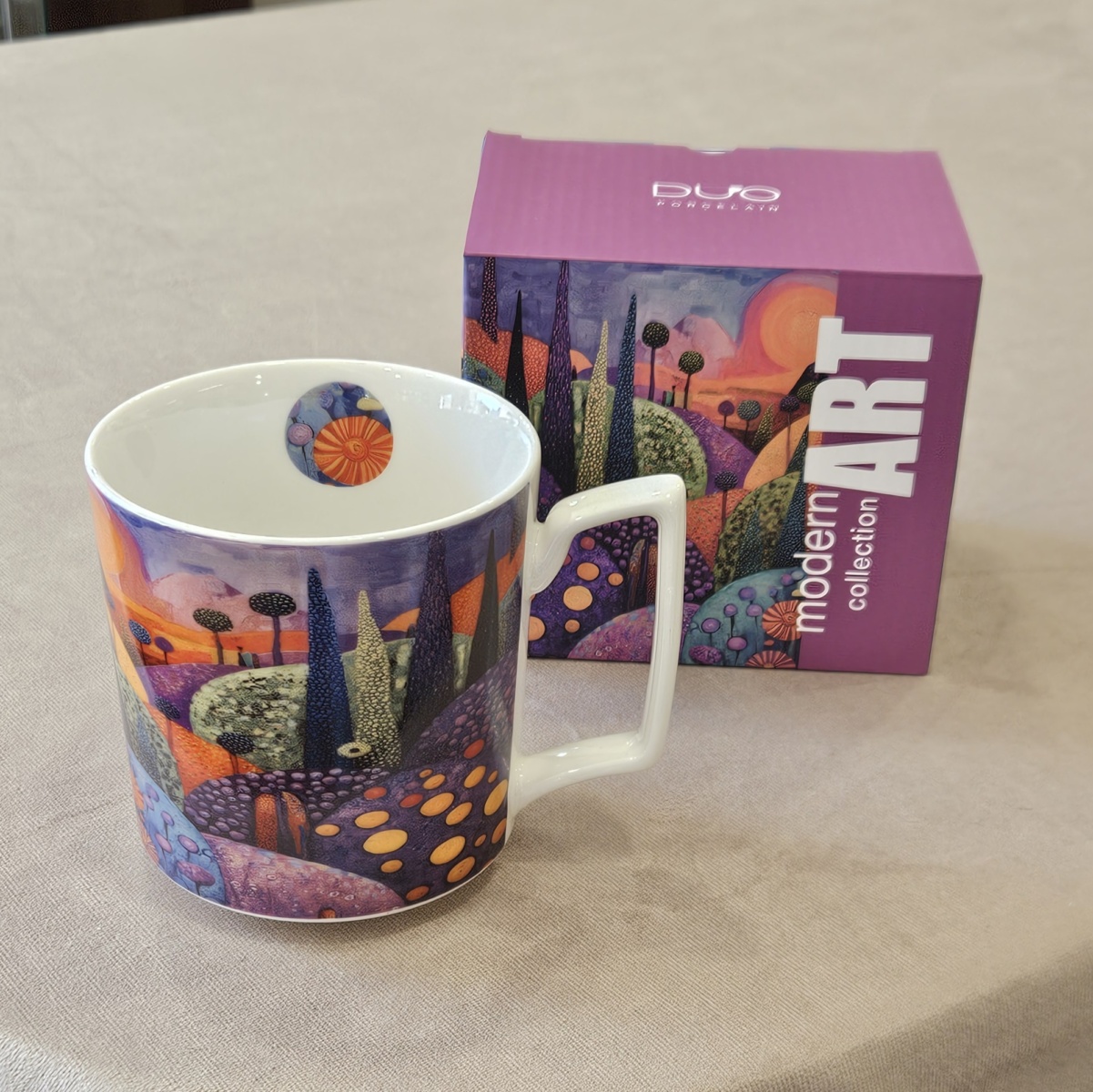 Linia zdobiona nowoczesnym i artystycznym wzorem malowniczego pejzażu falujących wzgórz, pełnych życia i ekspresji. Intensywna paleta kolorów – od głębokich fioletów i różów w tle, przez intensywne pomarańcze i żółcie, aż po soczystą zieleń i spokojny błękit w pierwszym planie, tworzy harmonijną kompozycję. Wzór łączy w sobie tradycyjne rzemiosło z nowoczesnym designem o niezwykle świeżym charakterze.