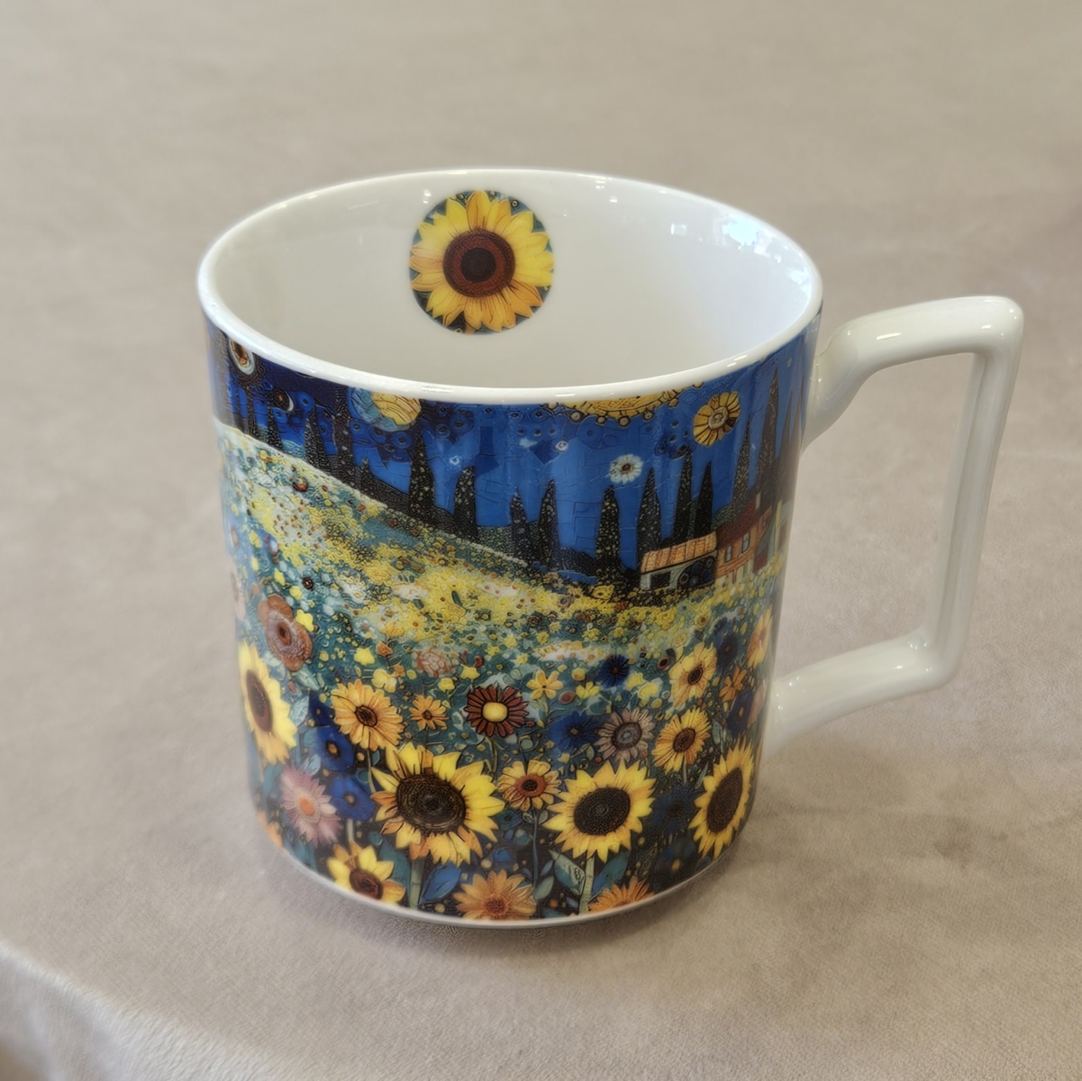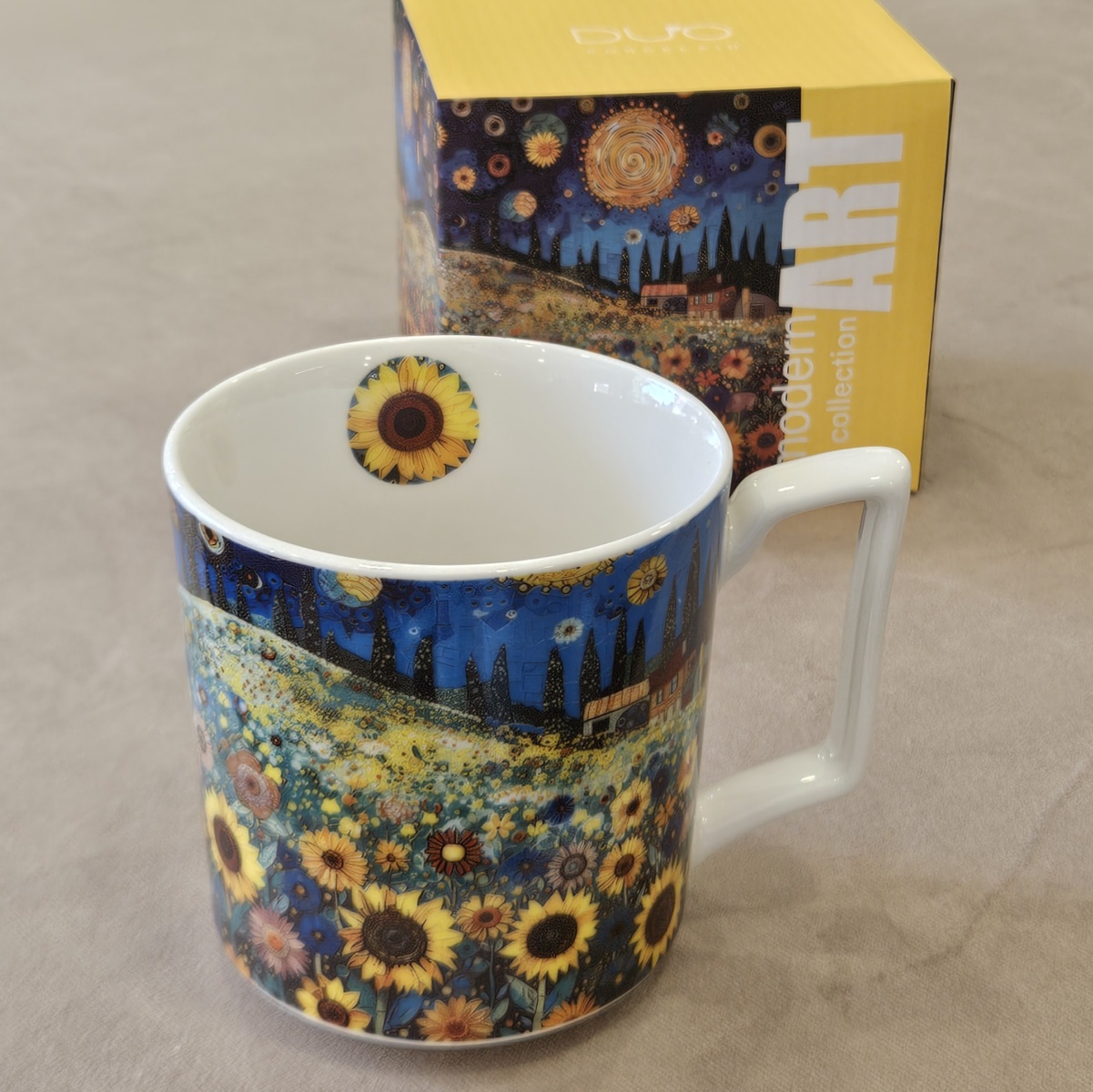 Kubek SUNFLOWER FIELD wchodzący w skład linii MODERN, wykonany z porcelany New Bone China, charakteryzującej się elegancką i naturalną kremowo – białą barwą z delikatnym połyskiem a także wyjątkową wytrzymałością przy zachowaniu lekkości i delikatności.