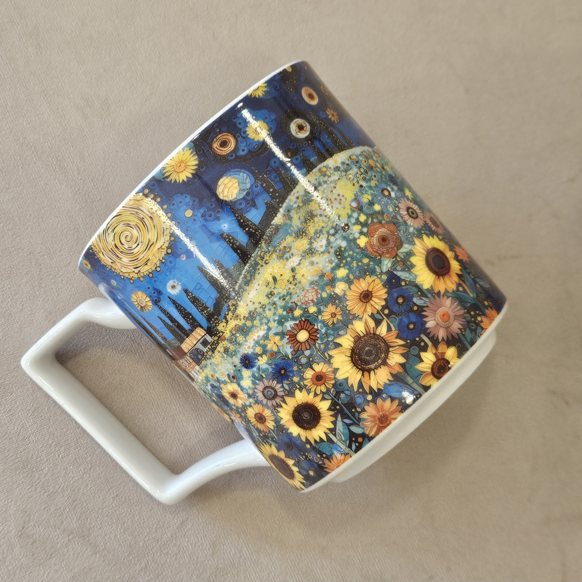 Linia zdobiona zachwycającym obrazem, który przedstawia pole słoneczników sięgających ku gwiaździstemu niebu. Żółte kwiaty, rozkwitające na tle intensywnie błękitnego nieba, tworzą magiczną atmosferę, która przenosi w świat marzeń i inspiracji. Ten niezwykły motyw pobudza wyobraźnię i zachęca do odkrywania piękna w codziennym życiu.