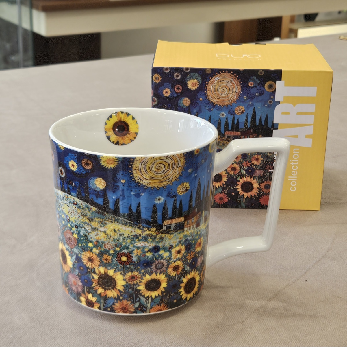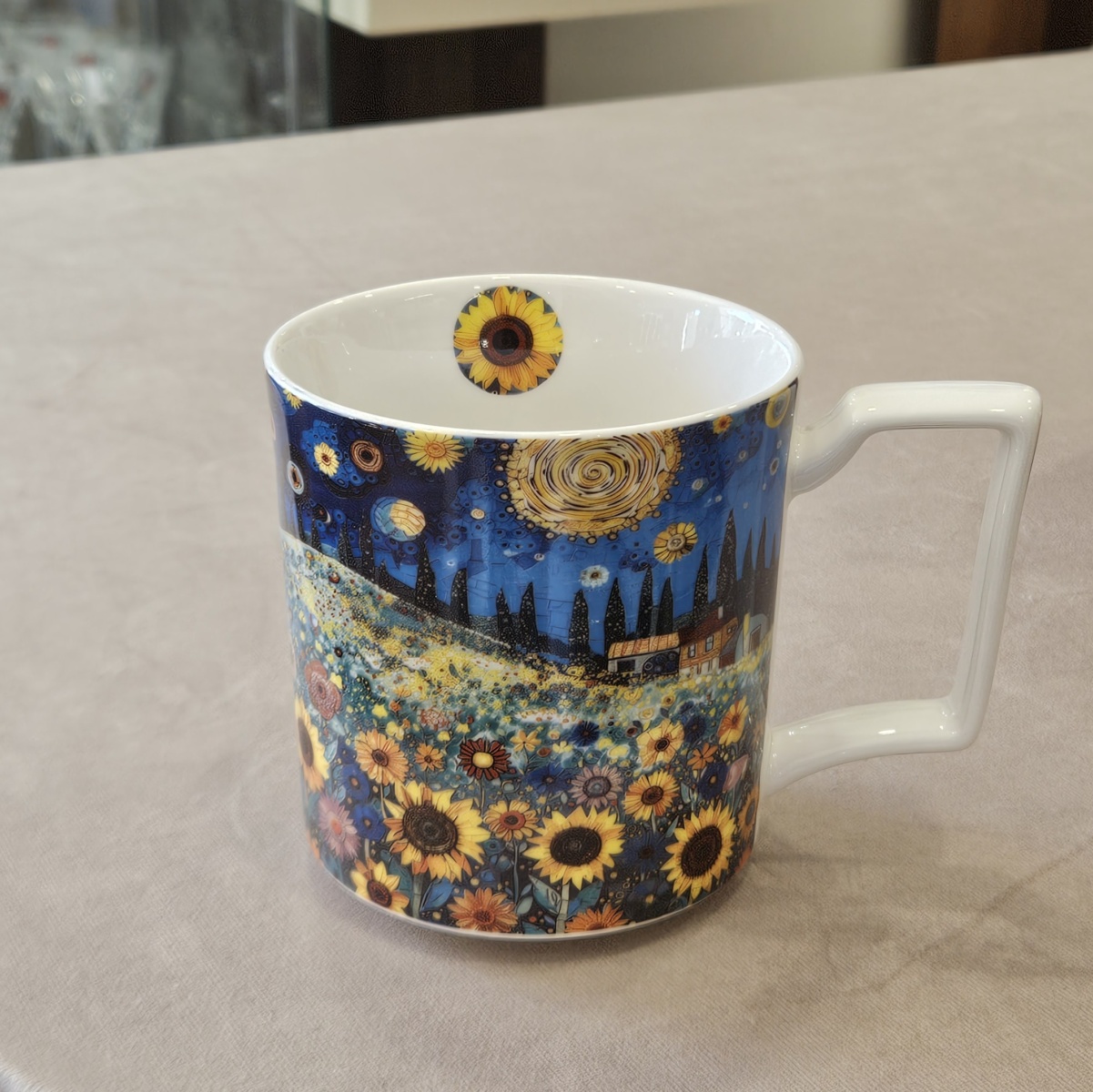 Kubek duży SUNFLOWER FIELD wchodzący w skład linii MODERN, wykonany z porcelany New Bone China, charakteryzującej się elegancką i naturalną kremowo – białą barwą z delikatnym połyskiem a także wyjątkową wytrzymałością przy zachowaniu lekkości i delikatności.