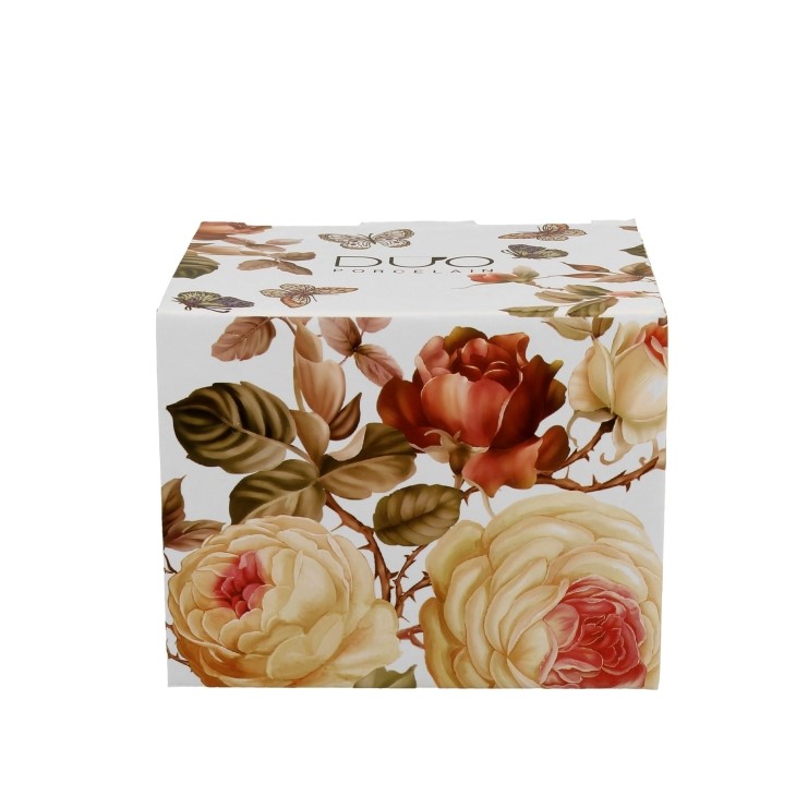 Linia wykonana z białej porcelany zdobionej wyrazistym motywem herbacianych róż w ciepłych, pastelowych kolorach.
