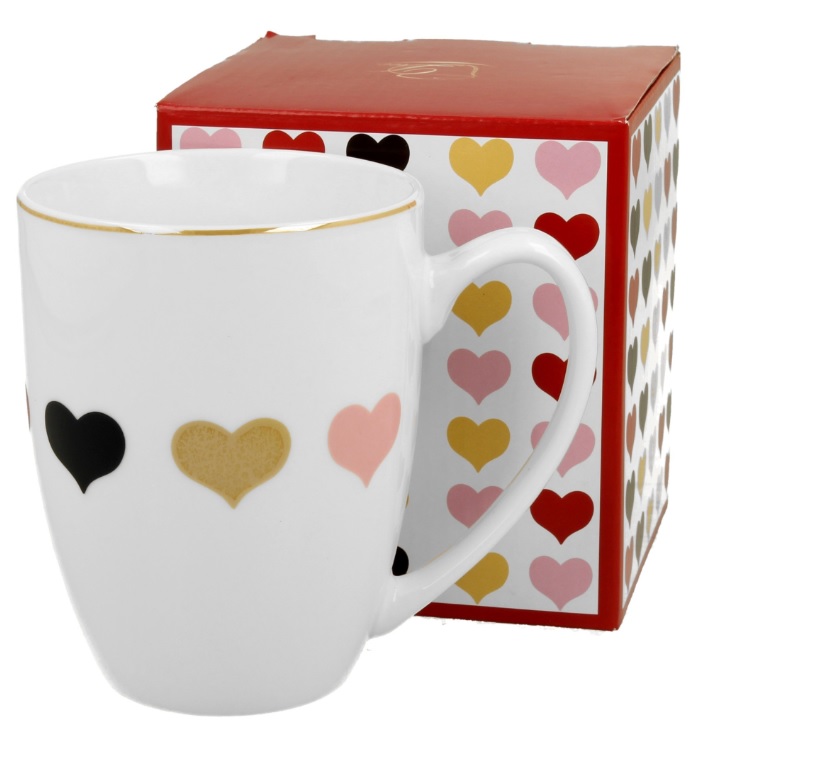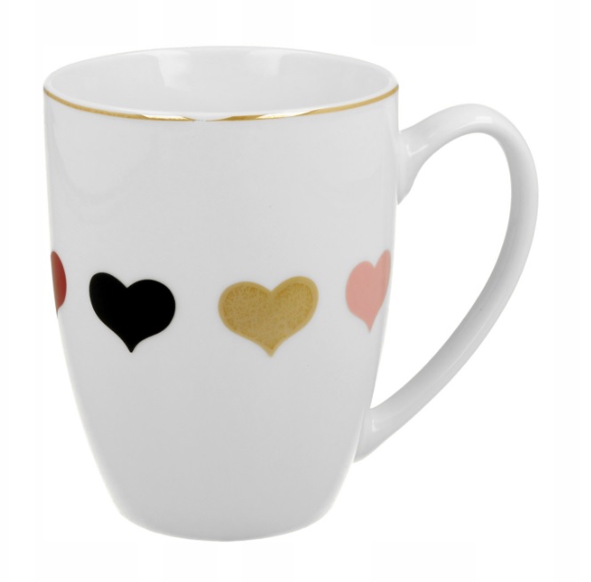 Kubek zdobiony czterema serduszkami w kolorze złota, soczystej czerwieni, granatu i różu.