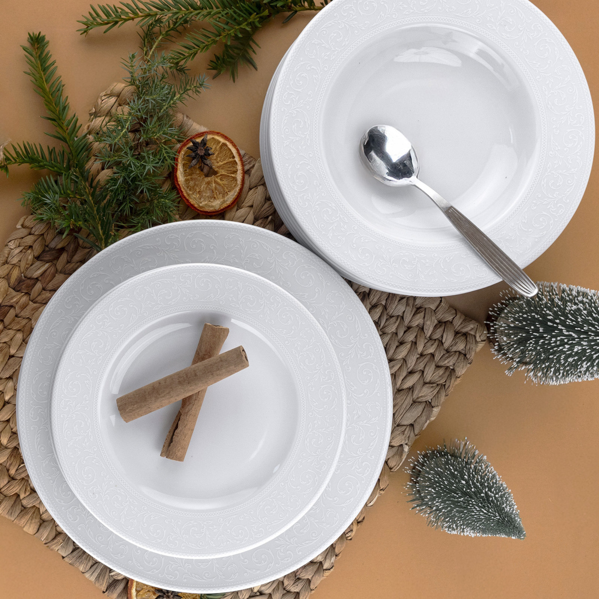 Zestaw dla 4 osób, składający się z 12 elementów. Biała subtelna dekoracja.