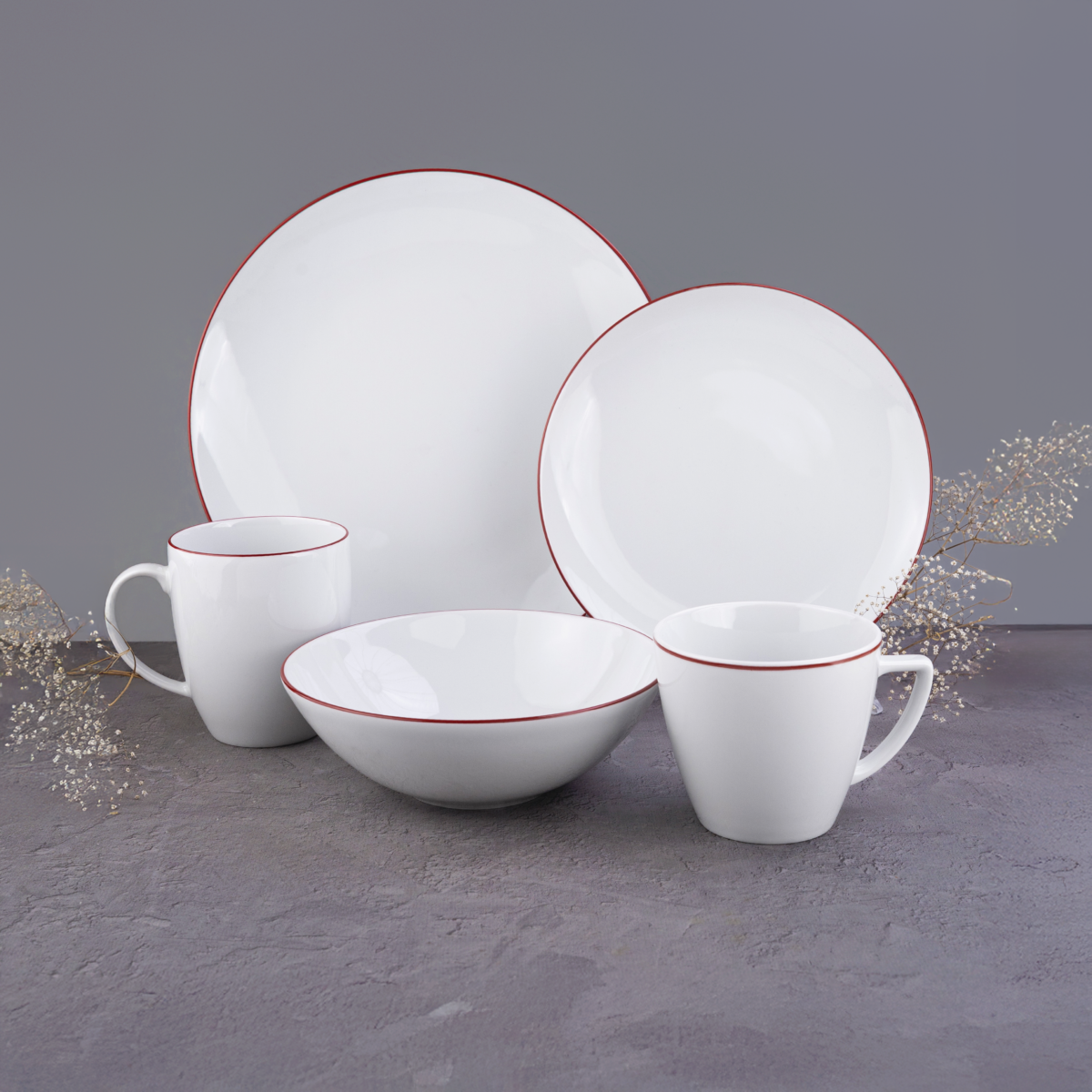 Elegancka kolekcja białej porcelany z subtelnym, kolorowym rantem, który nadaje jej nowoczesnego charakteru. Minimalistyczna forma i delikatne wykończenie sprawiają, że zastawa doskonale sprawdzi się zarówno na co dzień, jak i podczas wyjątkowych okazji.